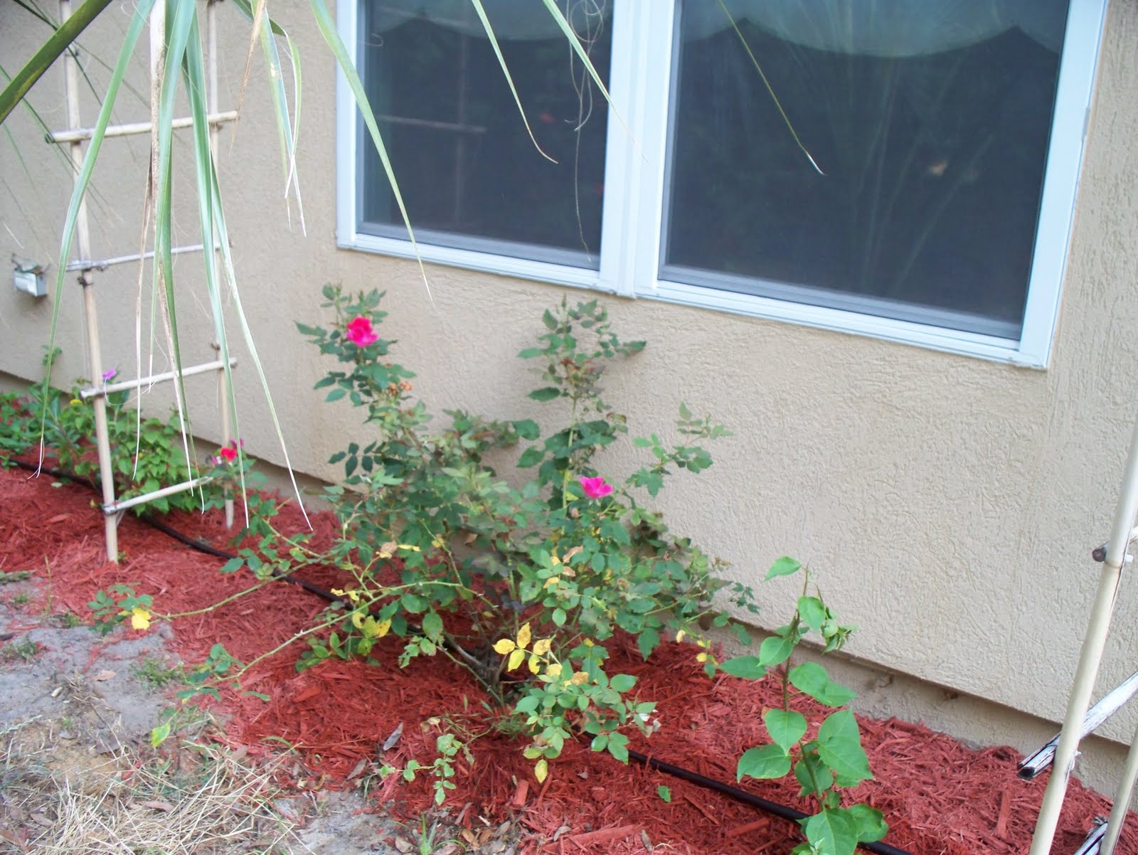 and then the back of the house where the plumbago and mexican petunias are spreading out.Where there was a gap in the hedge, we planted the philedendron and new robellini palms .