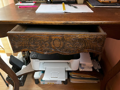 When I turned the drawer over, I could still read the label. To my surprise, this library desk is valuable! I think it will stay in the family for now, though.