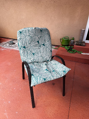 Two chairs done and four to go! I have all the measuring down, so it is a simple task to sew down one end and the side, turn right side out, stuff the old cushion in the tube